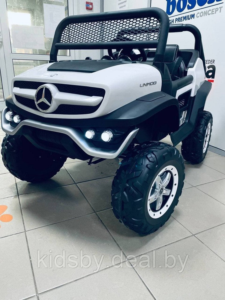 Детский электромобиль RiverToys Mercedes-Benz Unimog Concept 4WD P555BP цвет белый полноприводный двухместный (ЛИЦЕНЗИОННАЯ МОДЕЛЬ) с дистанционным управлением. Полноприводный. Двухместный. Аккумулятор: 12V/14Аh. Редуктор: 4*12V/10000 об. Световые эффекты: фары передние (диодные огни), задние фары. Звуковые эффекты: заводские мелодии, звук клаксона. Пульт управления: индивидуальный (настраивается по Bluetooth), от батареек 2шт AA 1,5V. Амортизаторы: да, передние, задние. Колеса: EVA резина. Скорость: скорость вперед высокая/низкая, одна назад (до 7 км/ч). Кнопка переключения 2WD/4WD: да. Сидение: двухместное, кожаное, 2 ремня безопасности 3-х точечных. Включение: кнопка. Медиа-панель: индикатор заряда батареи, USB-вход, Bluetooh, mp3-вход. Коврик: да. Размер собранной модели: 130*88*84см, вес: 32кг, макс. нагрузка: 50 кг.
